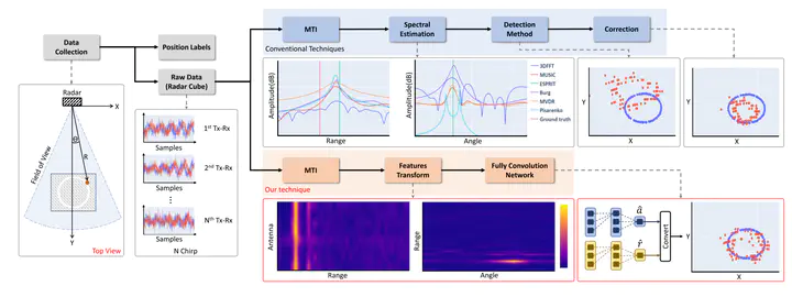 We propose a deep learning-based approach to localizing a small moving object with a single millimeter-wave frequency-modulated continuous-wave (FMCW) radar. The main challenge that foils conventional localization techniques, such as 3-D fast Fourier transform (3-D-FFT), Pisarenko method, multiple signal classification (MUSIC), estimation of signal parameters via rotational invariance technique (ESPRIT), Capon’s method, and Burg’s method, is the low signal-to-noise ratio of the reflected signal from millimeter-sized objects. Our key idea is to combine useful but noisy features from classical transforms [e.g., fast Fourier transform (FFT)] with neural networks that can refine and interpret those features into range and angle estimates by training on a large dataset of examples. Importantly, our networks were designed to be translation-equivariant, which enables accurate predictions of unseen object locations and improves the range and azimuth root mean square error (RMSE) scores by 34%–46% and 41%–60%, respectively, over state-of-the-art approaches. This pilot study establishes a new baseline for small-object tracking using FMCW and can enable tracking of small animals, such as ants inside the colony for behavior studies. Our first FMCW-small-object dataset and the source code are publicly available on https://github.com/shikuzen/RA-CNN .